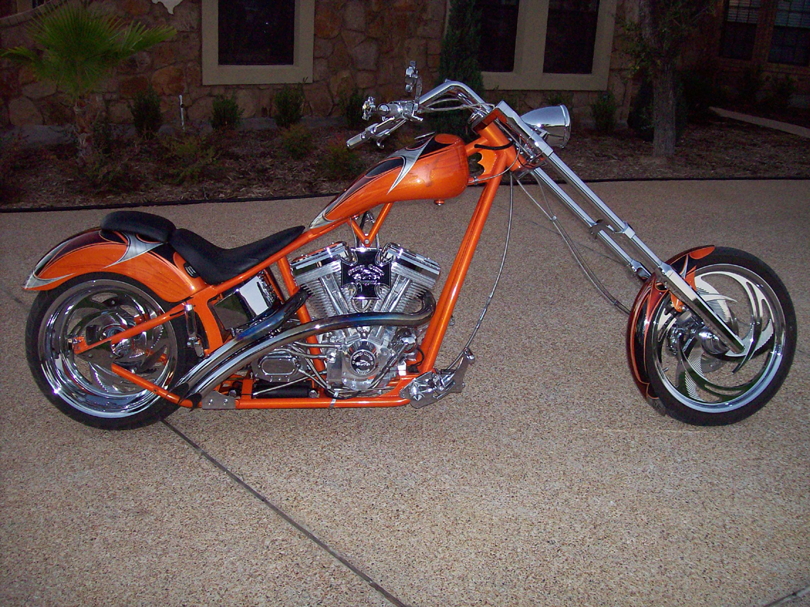 A motorcycle that has an extended front end with a greater angle than standard bikes. The term originates from the fact that early riders would cut away, or chop, unnecessary portions of the bike and frame to reduce weight. The raked front end makes for a motorcycle that is stable but not agile. Recently, these bikes have gain attention through the popularity of Jesse James of West Coast Choppers and the Tuttle family's Orange County Choppers, featured on the Discovery Channel. |
